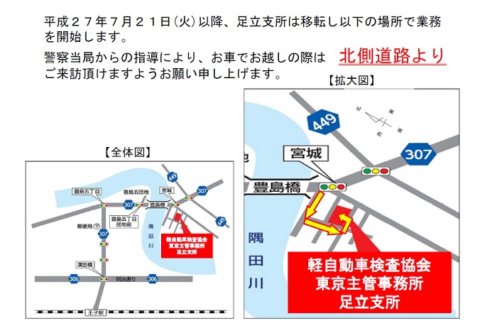 小菅JCT方面からの場合は扇大橋出口を降りて都道308号線を進行方向の川口方面に向かい、道なりに500m進むと王子、江北橋方面左折の看板がありますので、都道307号線と交差する江北橋交差点を左折し(王子方面)、江北橋を渡り2つ目の信号機(宮城交差点)手前で、左の側道に入り、宮城交差点を直進し「みやぎ水再生センター方面」に向かいますと150m程で右手に案内看板がありますので、その交差点を左折しますと当協会があります。